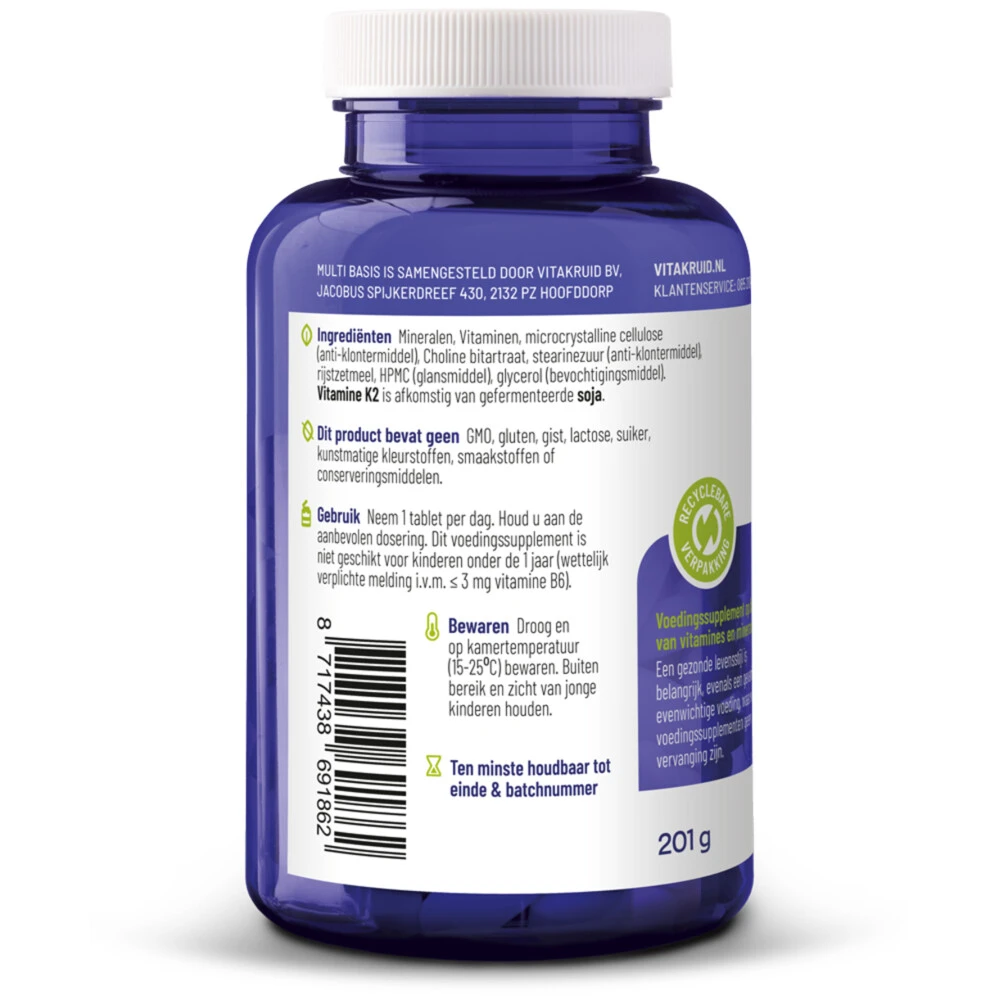 Vitakruid Multi Basis Vitakruid Multi Basis Tabletten is een multivitamine met alle met alle nutriënten in de best opneembare vormen wereldwijd. Vitakruid Multi Basis Tabletten bevat alle vitaminen en mineralen in minimale doseringen en geen kruiden, aminozuren of enzymen in verwaarloosbare hoeveelheden.  Vitakruid Multi Basis Tabletten is perfect voor diegenen die de behoefte hebben aan lichtere doseringen in de juiste verhoudingen, en dat alles in een dagdosering van slechts &ea