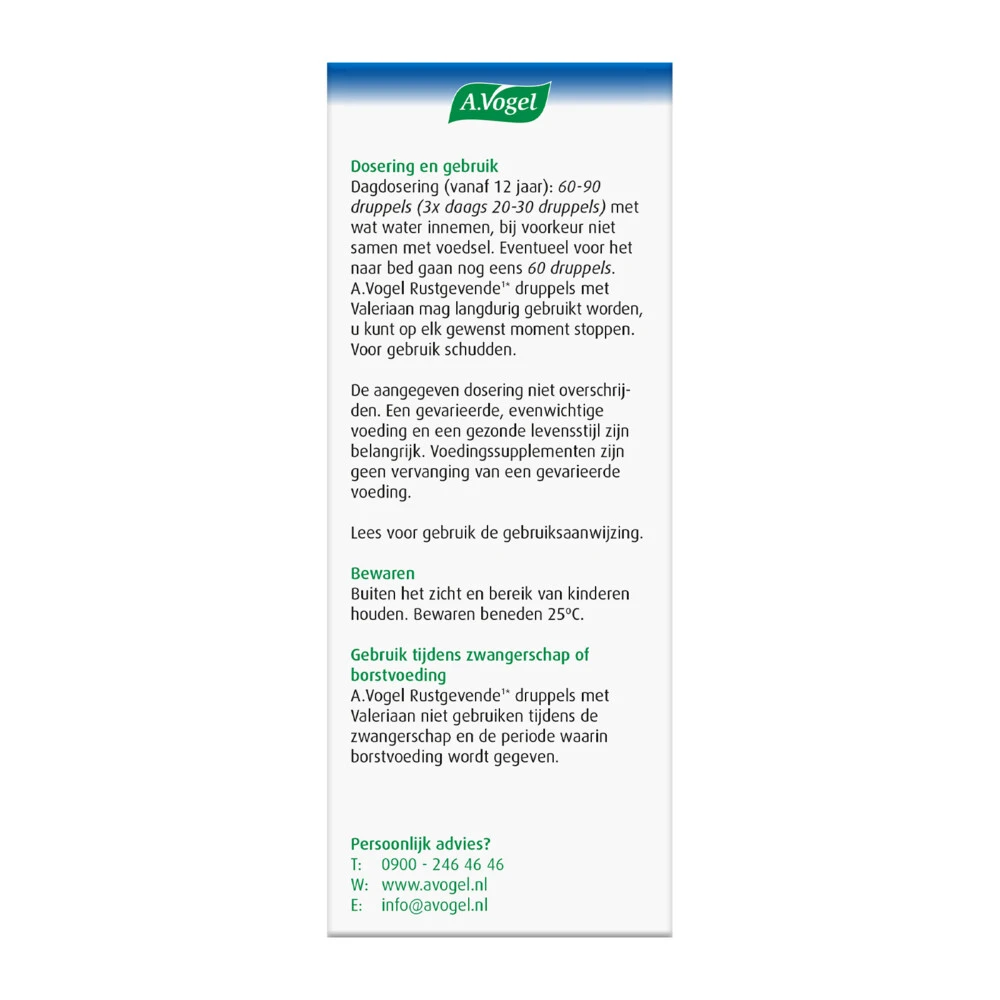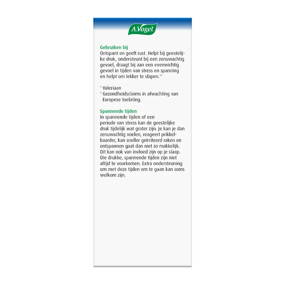 A.Vogel Valeriaan druppelsA.Vogel Valeriaan Ontspannend en Rustgevende1* druppels is een kruidenpraparaat op basis van Valeriaan. Â Valeriaan helpt bij geestelijke druk*, rusteloosheid*, gespannenheid* en zorgt voor evenwichtigheid tijdens spannende periodes*. Daarnaast helpt Valeriaan ook om lekker te kunnen slapen*.1 Valeriaan*Gezondheidsclaims in afwachting van Europese toelating.