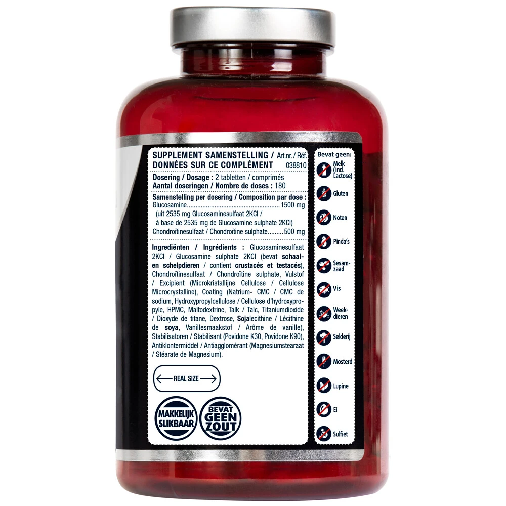 Lucovitaal Glucosamine ChondroïtineGlucosamine Sulfaat is een zeer goed opneembare vorm van Glucosamine. Lucovitaal Glucosamine Chondroïtine:Is zeer goed opneembaarBevat de geadviseerde elementaire hoeveelheidEén dagdosering bevat 1500 mg Glucosamine en 500 mg Chondroïtine