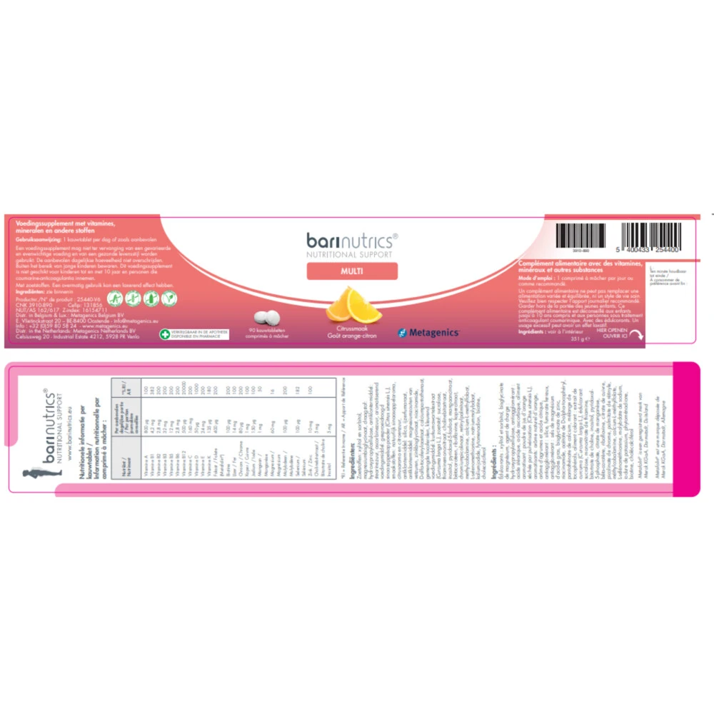 Metagenics Barinutrics Multi CitroenMetagenics Barinutrics Multi kauwtabletten met Citroensmaak bevatten een nutritionele ondersteuning die van belang zijn vóór en na een maagverkleining om voedingstekorten te voorkomen. Dezekauwtabletten bevatten een bijzondere mix van vitamines en mineralen in goed opneembare, actieve vormen en voorziet het lichaam in de dagelijkse behoefte aan vitamines en mineralen om in goede conditie te blijven. Je hebt maar 1 kauwtablet per dag nodig die je
