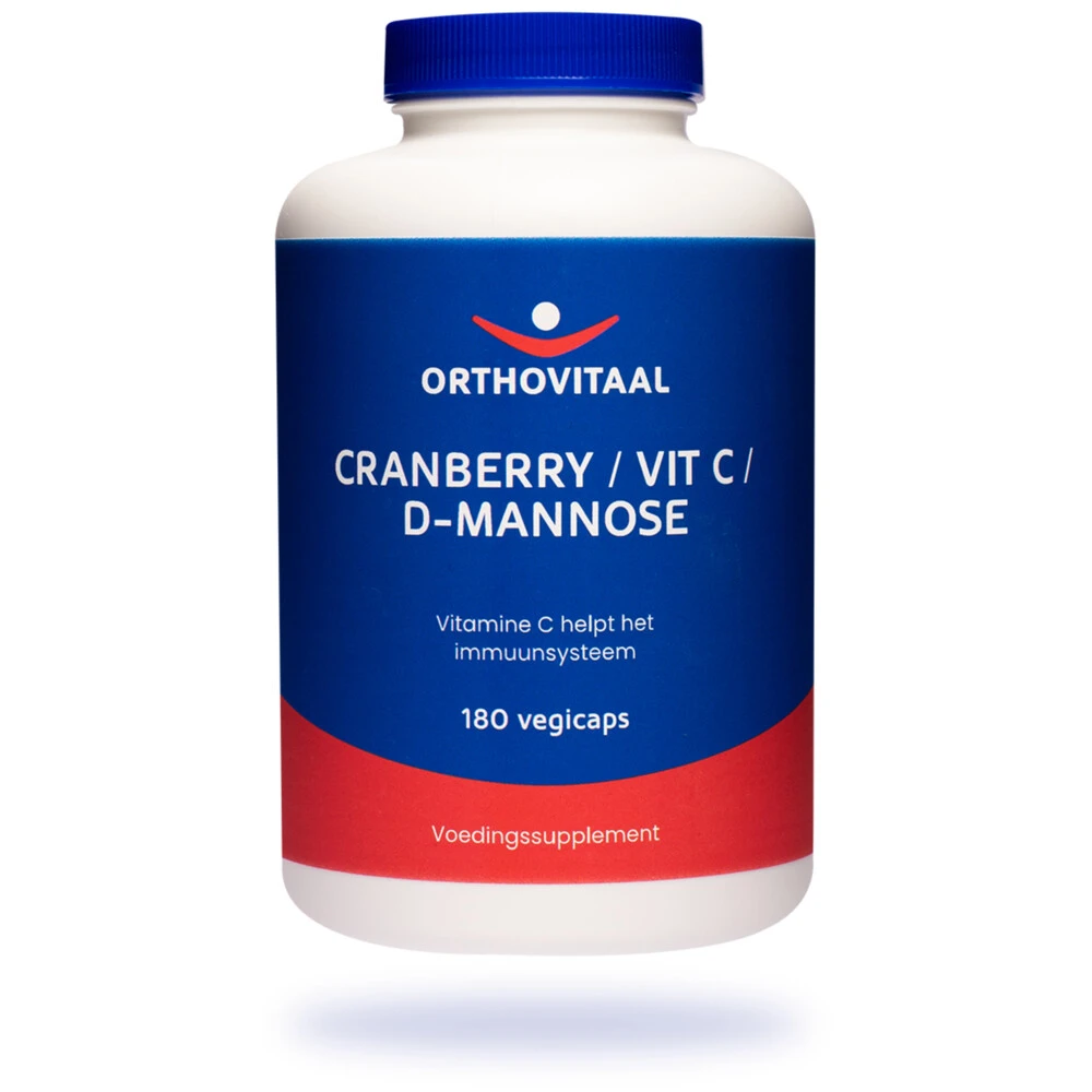 Orthovitaal Cranberry Vitamine C & D-MannoseOrthovitaal Cranberry Vitamine C & D-Mannose combineert cranberry met D-mannose en vitamine C. Cranberry, ook wel veenbes genoemd, is een plant die oorspronkelijk uit Noord- Amerika komt. Deze rode bes heeft een zure smaak en bevat van nature een aantal organische zuren. D-mannose is een natuurlijke pentose suiker, een epimeer van glucose, die relatief veel voorkomt in fruit. Vitamine C draagt bij aan het behoud van een goede/sterke weerstand t