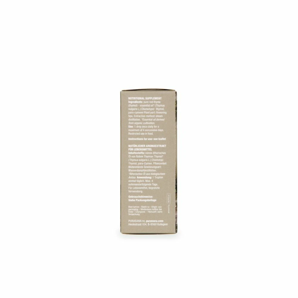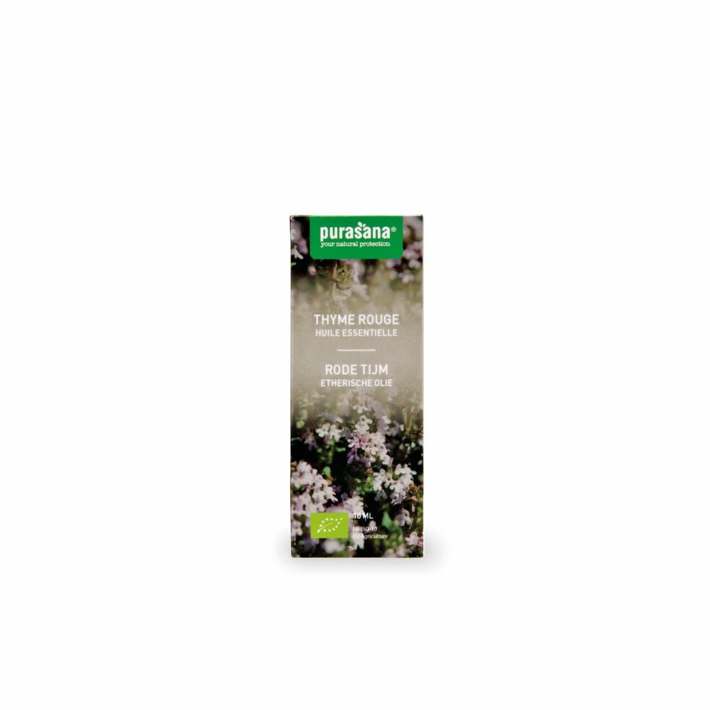 Purasana Rode Tijm BioDe etherische olie van rode tijm heeft een kruidige, bijna stekende geur. De olie is afkomstig uit Spanje en wordt via stoomdestillatie gewonnen uit de bloeiende toppen van de tijmplant. Rode tijm verhoogt en ondersteunt de weerstand en heeft een verzachtende werking op luchtwegen & keel. Daarnaast heeft het een positieve werking op de spijsvertering en de darmen.De olie van rode tijm heeft diverse doeleinden. Zo kan je het gebruiken tijdens het baden, op de huid (verdu