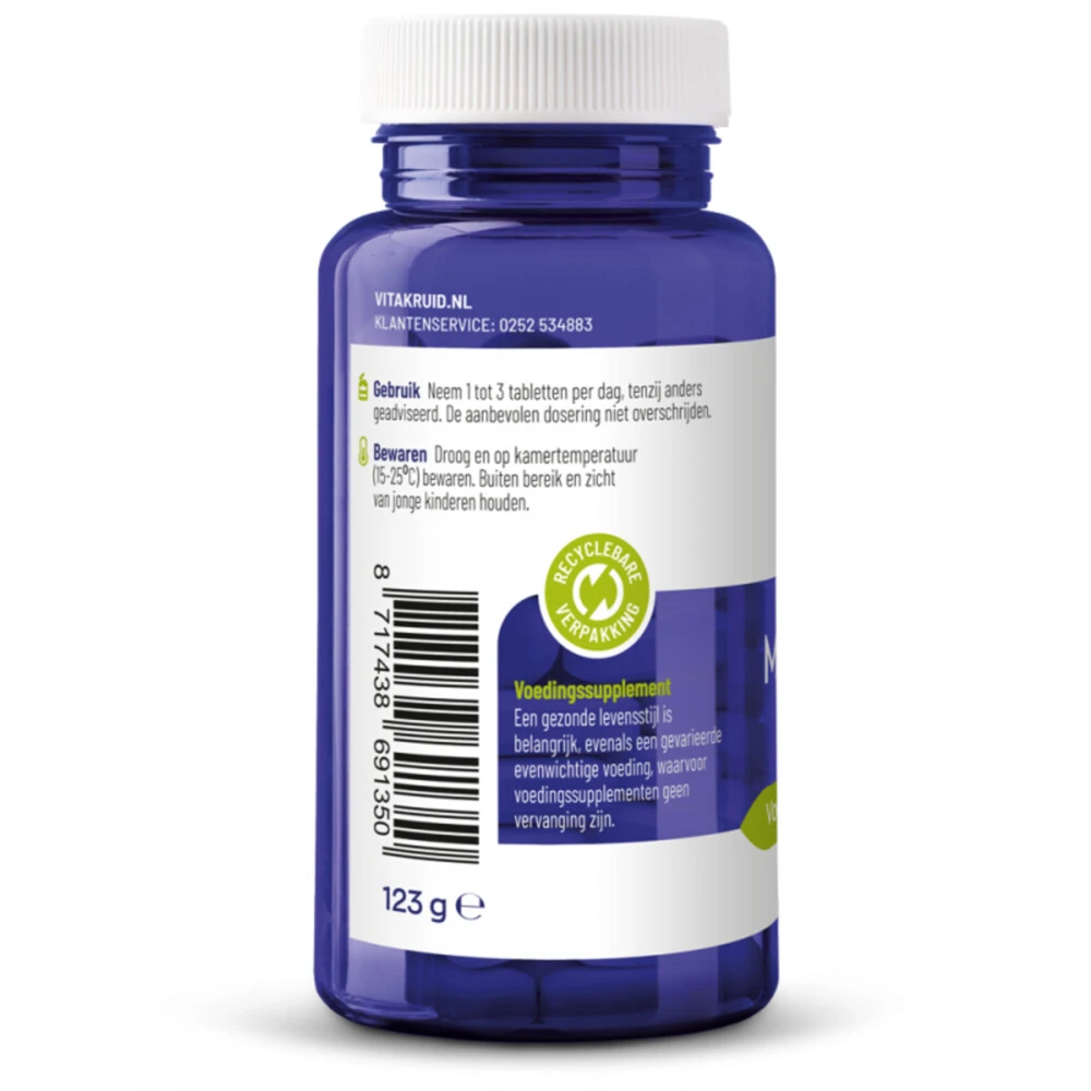 Vitakruid Magnesium 150 BisglycinaatVitakruid Magnesium 150 Bisglycinaat Tabletten is een voedingssupplement met magnesium in de vorm van bisglycinaat. De binding aan glycine maakt dat magnesiumbisglycinaat goed de bloed-hersenbarrière passeert. Hierdoor is deze vorm van magnesium een goede keuze voor diverse toepassingen binnen de hersenfunctie. Het is goed voor een verbetering van de gemoedstoestand, concentratie en meer geestelijke energie. Bovendien heeft de organische vorm een hoge b