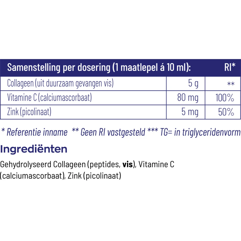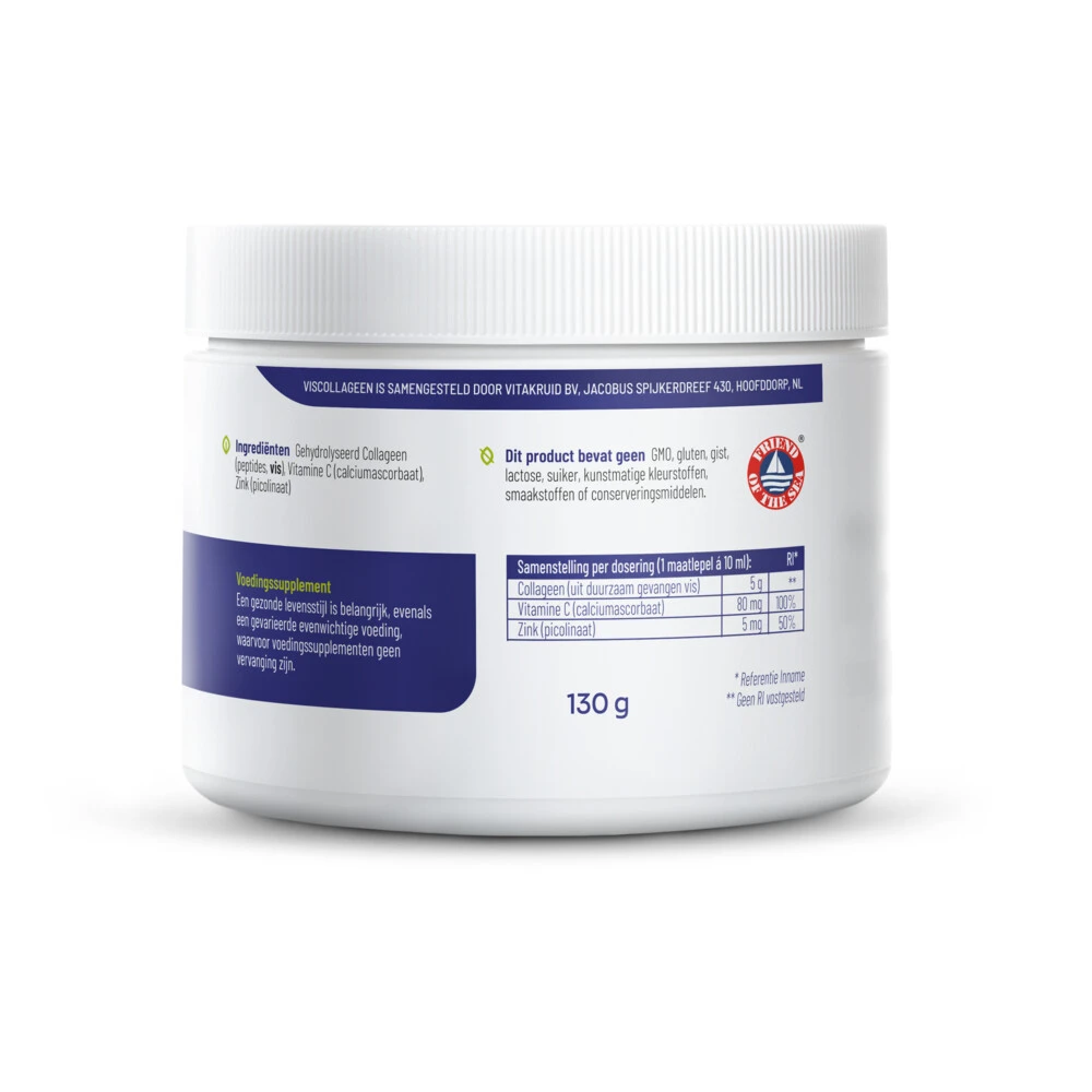 Vitakruid Pure Viscollageen Poeder Met C en ZinkVitakruid Viscollageen Poeder is een ideale combinatie van Viscollageen, Vitamine C en Zink. Collageen is een lichaamseigen eiwit dat belangrijk is voor de huid, nagels, botten, pezen en bindweefsel. Viscollageen is het meest verwant aan het type dat voorkomt in de menselijke huid. Zink voedt de huid van binnenuit en ondersteunt het herstellend vermogen van de huid. Vitamine C is van belang voor de vorming van collageen wat belangrijk is voor de hu